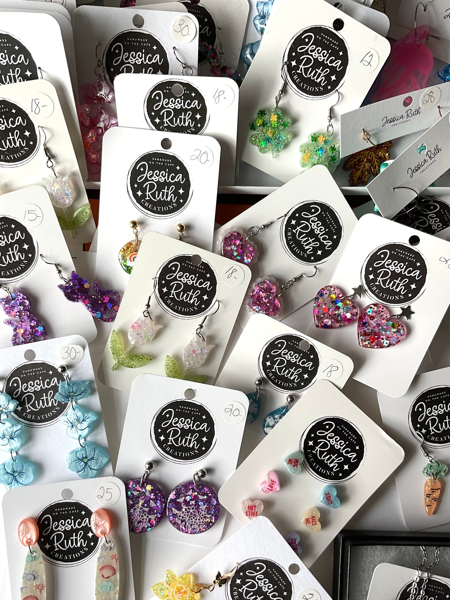My jewelry is all handmade with resin and hypoallergenic hardware for sensitive ears.