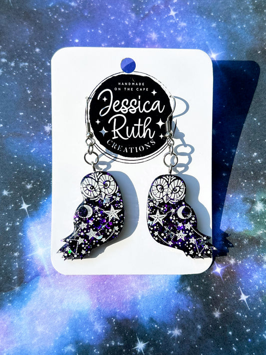 Deep Purple Celestial Owl Dangle Earrings