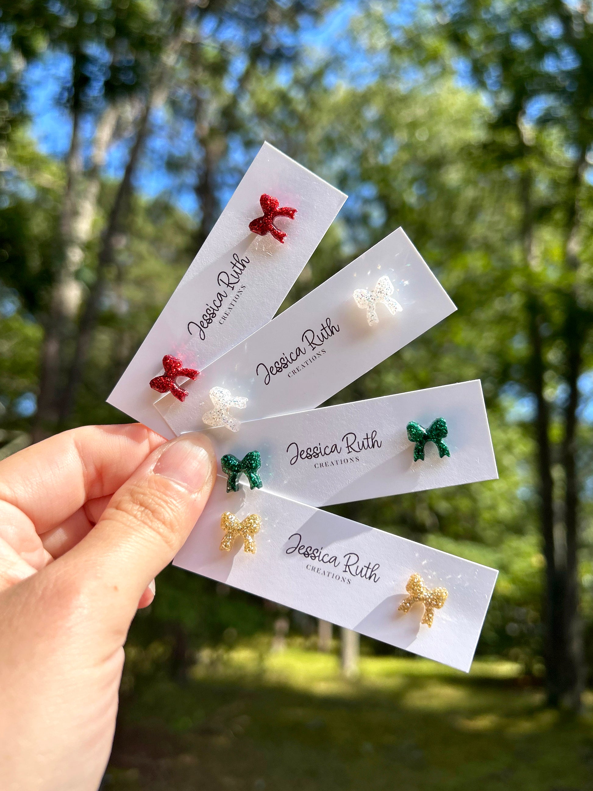 This listing is for one pair of cute holiday bow stud earrings. Available in red, white, green, and gold. Lightweight and small for sensitive ears. Handmade with hypoallergenic stainless steel posts.